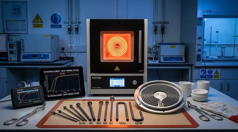 첨단 SiC 가열 솔루션으로 연구실 효율성을 최적화할 준비가 되셨습니까? KINTEK은 뛰어난 R&D와 사내 제조 역량을 활용하여 머플, 튜브, 로터리, 진공 및 분위기 용광로, CVD/PECVD 시스템과 같은 고온 용광로를 제공합니다. 당사의 심층적인 맞춤화 기능은 귀하의 고유한 실험 요구 사항을 충족하여 에너지 절약, 더 높은 처리량 및 안정적인 성능을 제공하도록 보장합니다. 지금 문의하여 당사 솔루션이 귀하의 공정에 어떻게 도움이 될 수 있는지 논의하십시오!