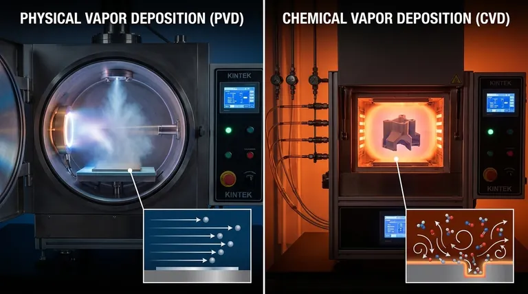 올바른 방법을 선택하려면 먼저 작용하는 뚜렷한 메커니즘을 이해해야 합니다. 이름 자체인 물리적 기상 증착 대 화학 기상 증착은 원자 수준에서 일어나는 일을 가장 정확하게 설명합니다.